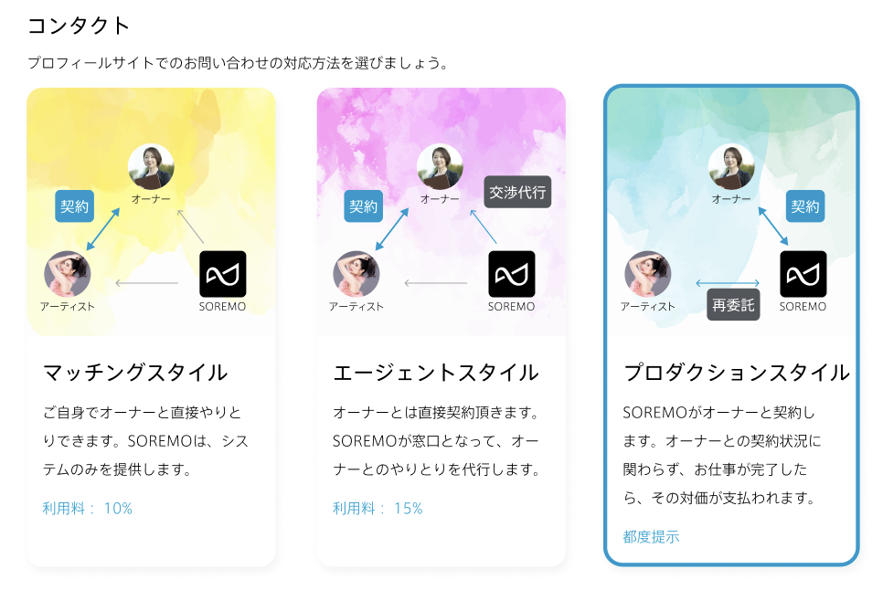 プロフィールサイトからのお問い合わせは、アーティストご自身で直接取引もできるようになりました。利用設定で「マッチングスタイル」を選択すると、お問い合わせ内容が直接アーティストに届きます。